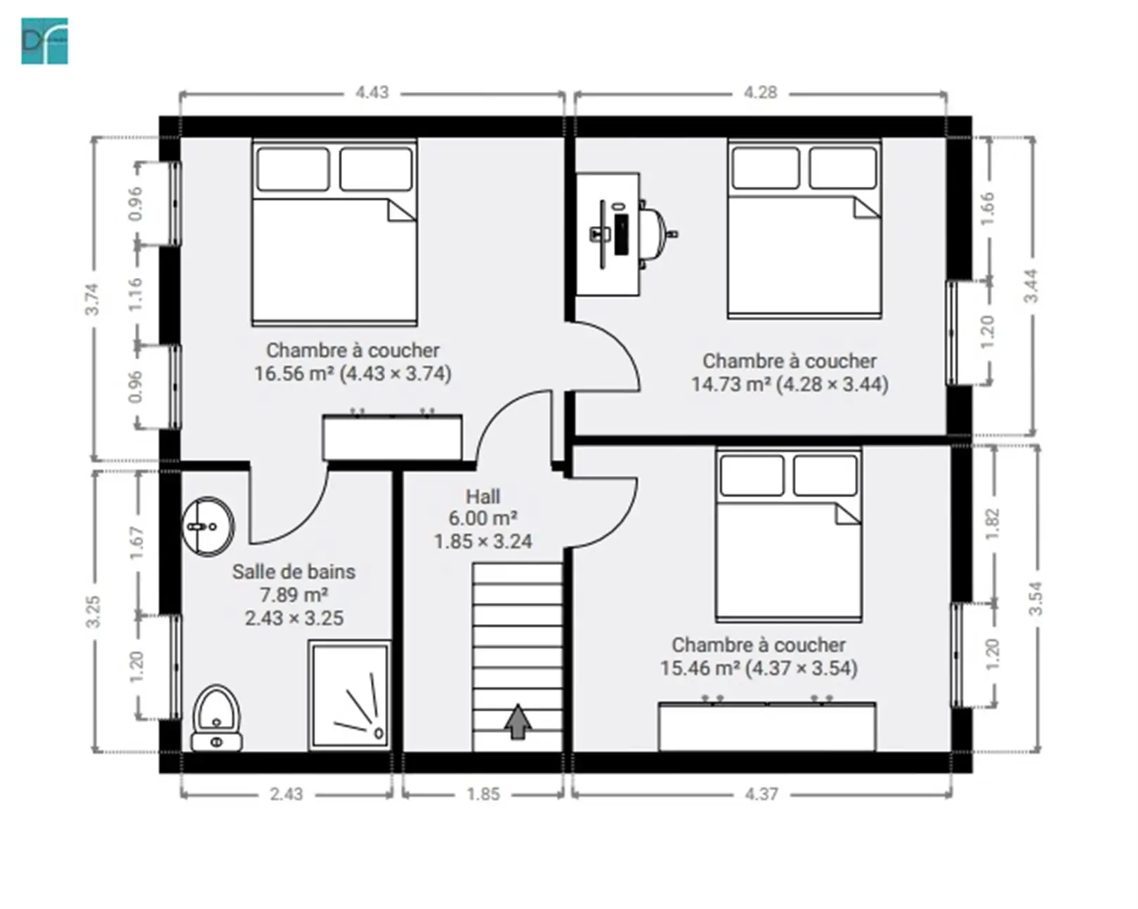 Chambre à coucher 4,4m x 3,7m = 16,6m²
