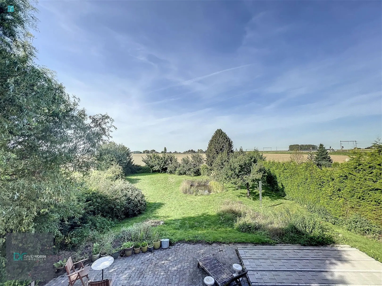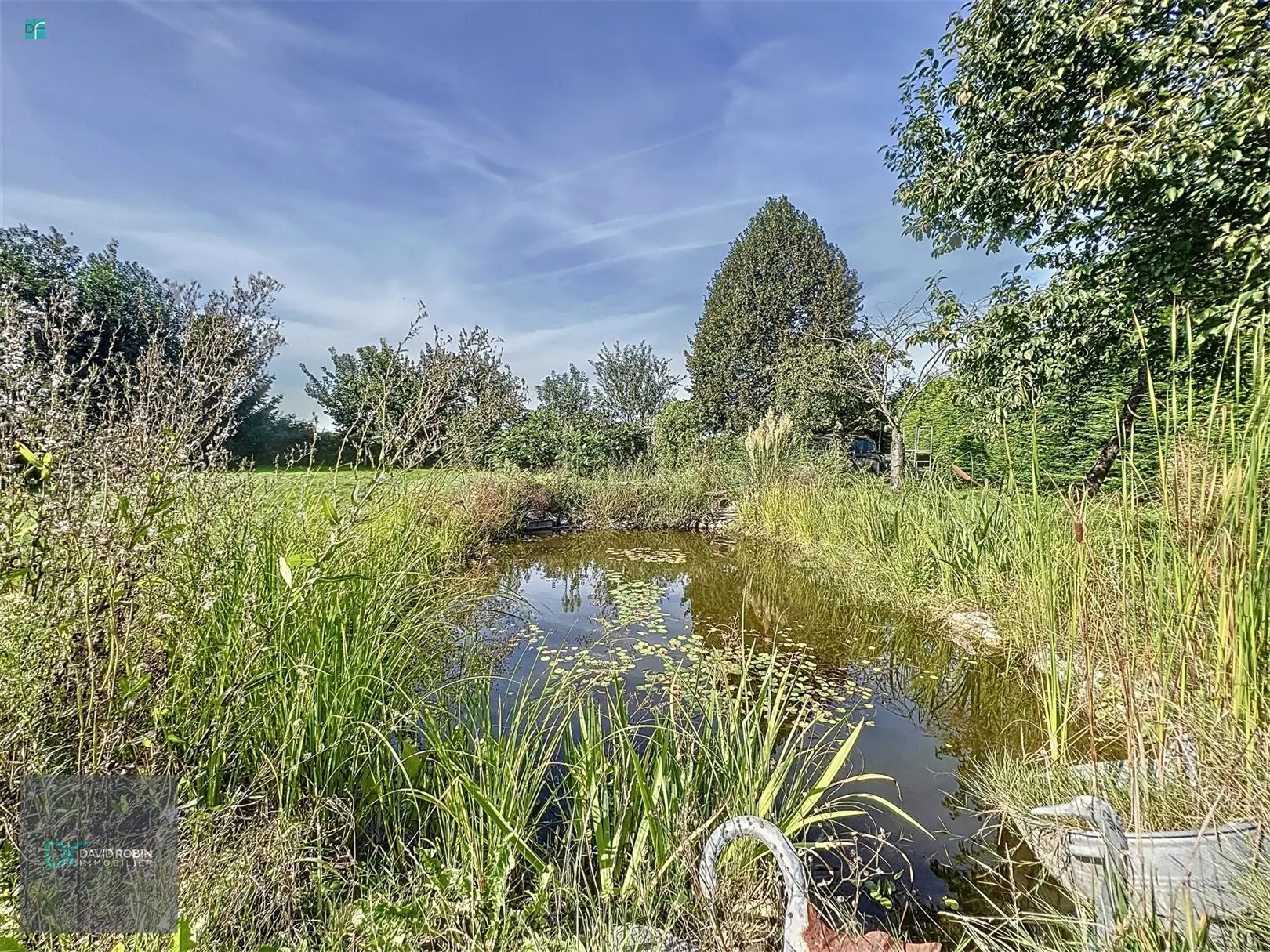 - Coquet jardin d\'une superficie de +/- 13 ares avec de nombreux arbres fruitiers et étang