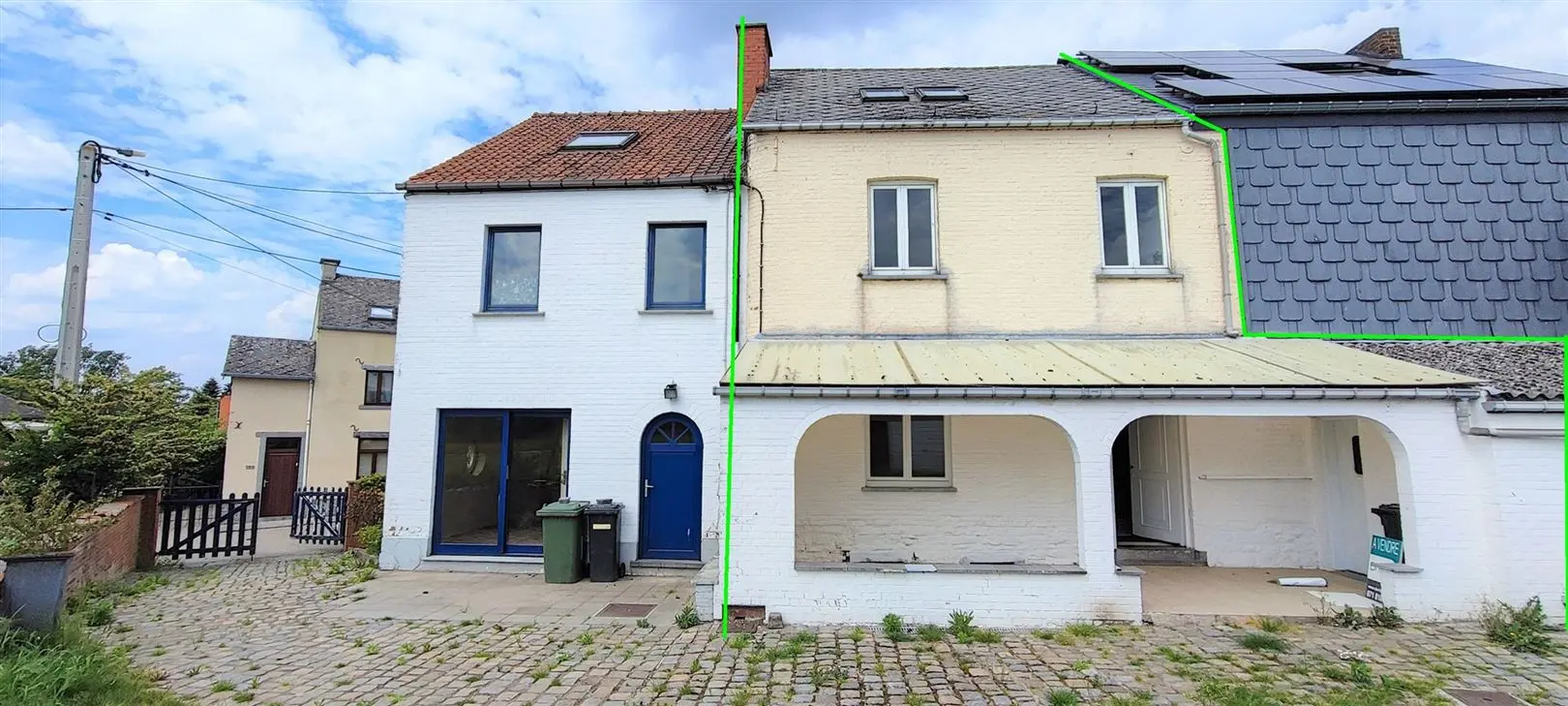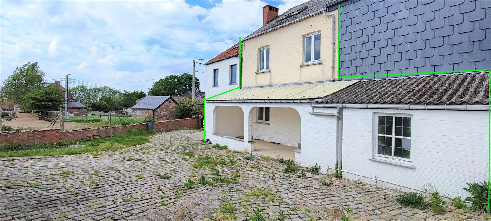 VENDU! SOMBREFFE-Impasse Chaussée de Chastres 92: Dans une impasse à la campagne, Bonne maison 2 façades en bon état sur terrain de +/- 22a comprenant: Sous-sol: une cave. Rez: hall, salon, cuisine équipée. 1er: 1 grande chambre, sdb complète + wc. 2ème: 2 chambres mansardées et douche. Commodités: Toiture en ardoises artificielles, châssis simple vitrage en bois, CC mazout, garage 1 voiture, beau terrain. !! Accès via servitude passage à pieds et en voiture via la maison de gauche. PEB F - 428 kwh/m²/an - CU: 20210215020055. Prix: 195.000 € (sous réserve d\'acceptation des propriétaires)