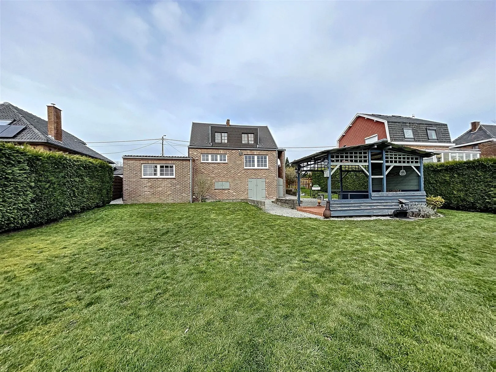VELAINE rue des érables : Magnifique villa rénovée de 2 chambres avec grand jardin, pergola et terrasse couverte. Idéalement située dans un quartier calme, cette jolie maison vous offre : au rez-de-chaussée : hall d\'entrée avec dressing, séjour en L avec bureau, cuisine équipée, salle à manger et salle de bains. Au premier : hall de nuit et 2 belles chambres. D\'un point de vue technique : Chauffage central au mazout, possibilité de mettre un poêle à bois ou à pellet, châssis double vitrage en bois et en pvc, volets électriques en partie, 25m² de panneaux photovoltaïques. Les exterieurs : vaste jardin de presque 11 ares exposé plein sud avec chalet de 15 m², pergola carrelée, terrasse couverte et grand garage.RC inférieur à 745 euros mais devra être révisé. PEB G 515 kWh/m² par an. CU : 20220206002426. Prix : 320.000 € (sous réserve d\'acception des propriétaires).