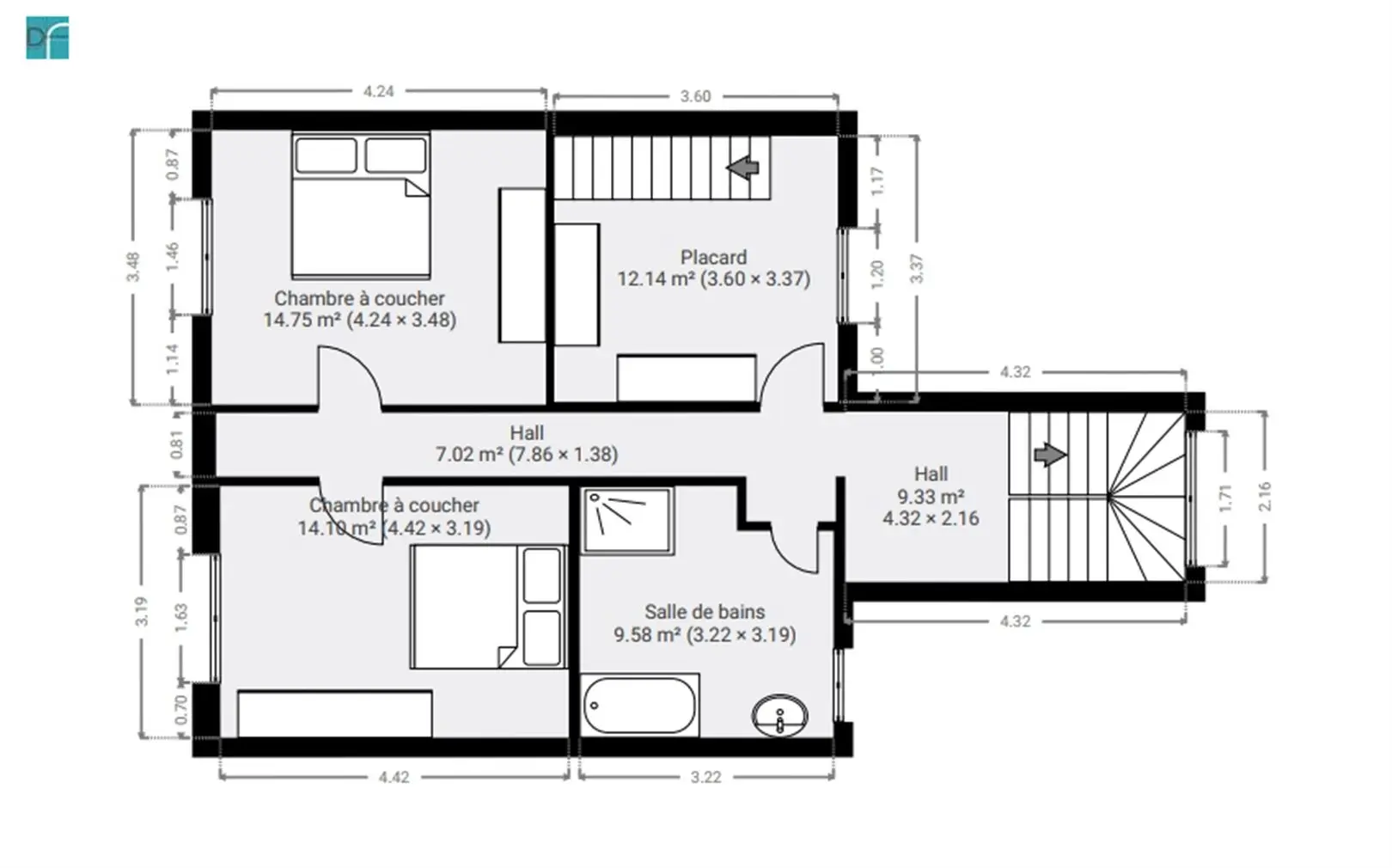 Chambre à coucher 4,2m x 3,5m = 14,8m²