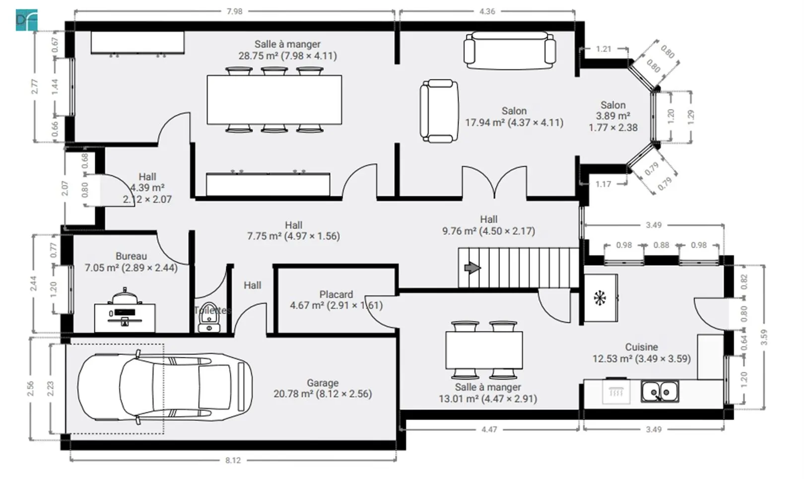 Salle à manger 8,0m x 4,1m = 32,9m²
